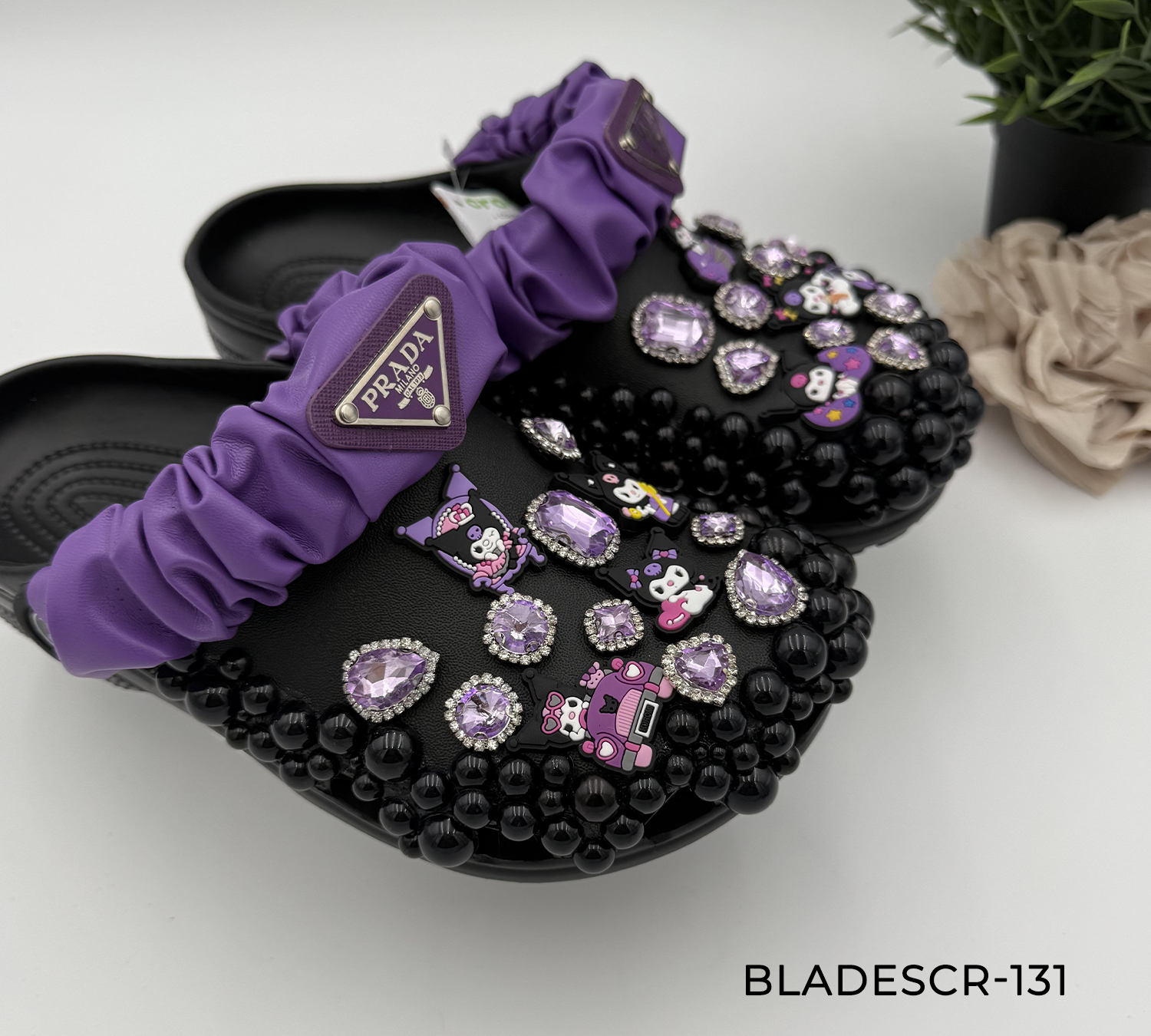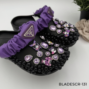 Beyond the dazzling rhinestone work, a unique pleated purple fabric heel strap is incorporated, which features a subtle, designer-inspired purple triangle logo embellishment to further elevate the shoe’s exclusive look. This detail provides both an extra layer of style and a secure, customized fit. If you’re looking for footwear that makes a bold, unapologetic statement at a casual event, an outing, or just in your daily routine, these clogs offer unparalleled sparkle and fashion flair.