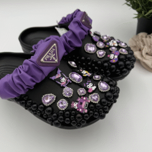 These striking Designer-Inspired Purple & Bling Black Clogs from Designs by DivaRn are a testament to glamorous custom footwear. Starting with a classic black clog base, the shoes are meticulously hand-embellished with a dense, glittering pattern of amethyst and clear rhinestones in various stunning shapes, transforming the casual shoe into a high-fashion statement piece. The black surface provides a dramatic backdrop that makes the purple and crystal gems truly pop, delivering an edgy, luxurious aesthetic perfect for those who want to blend ultimate comfort with high-end style.
